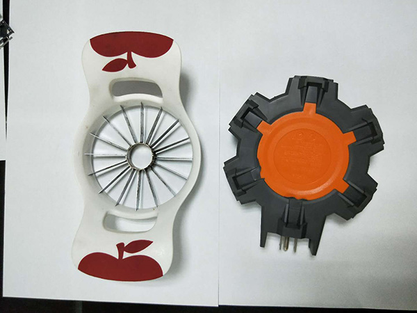 1、上模板配置二个上模具,圆盘上配置二个下模具,成型时圆盘做180度正反转交替。即可完成双色(双物料)的射出成型(或包覆成型)。